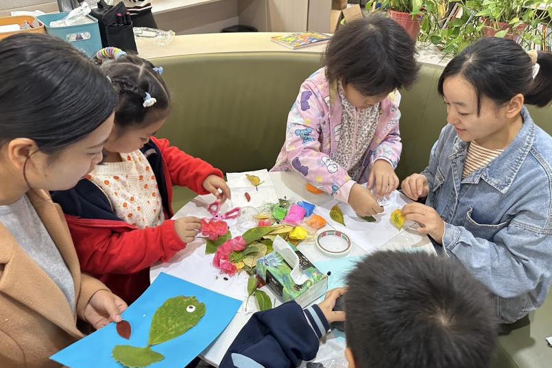在手工创作环节,亲子家庭围坐一桌,将采集的种子、落叶与颜料、卡纸巧妙结合,发挥无限创意。有的以银杏叶搭配松果勾勒出祖国的大好河山,有的用彩笔在卡纸上写下对祖国的祝福,再点缀上精心挑选的种子,让每一件作品都充满童真与温度。创作过程中,家长与孩子默契配合、欢声笑语不断,不仅锻炼了孩子们的动手能力与想象力,更在亲子互动中传递了对自然环保主题的热爱,让“循环”二字变得可触可感。