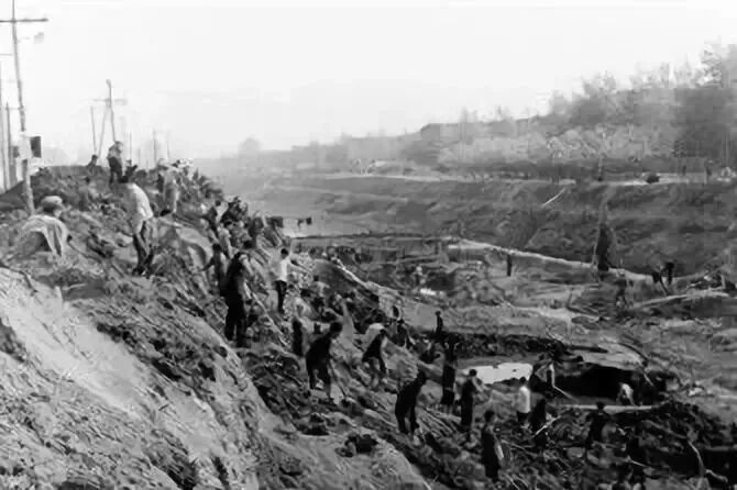 砌筑750米的导流明渠,需要近百万块砖、60多吨水泥、200多吨沙子。战士们搭成人梯,把砖、水泥和沙子,用双手从堤岸上几十米远的地方,传送到十几米深的河底;冬日里,河水刺骨,河底的指战员们站在齐腰深的淤泥中,一盆一盆把淤泥装进编织袋,在护城河外侧护坡上摆开“长龙阵”向河岸传递,每人每次平均负重30多公斤……